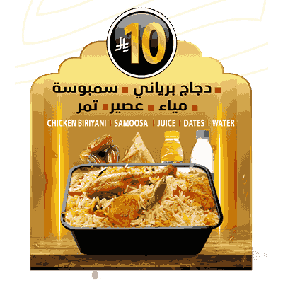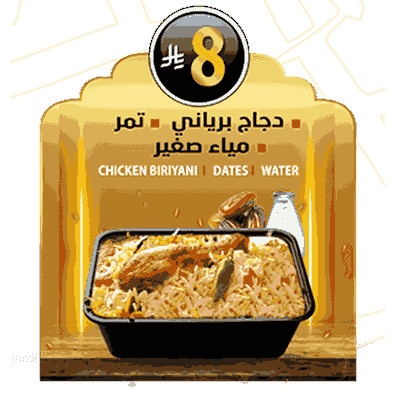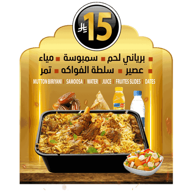 Iftar Combo 5 Mutton Biriyani,Samoosa, Water,Fruits Slides Juice,Dates – 15 SAR